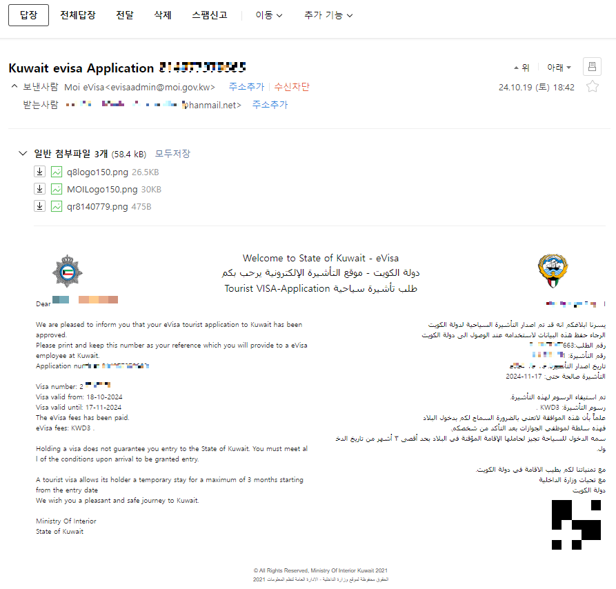 다른데는 pdf 파일로 딱 만들어서 보내주는 나라도 있는데, 쿠웨이트는 받은 이메일을 출력해서 들고가면 된다.