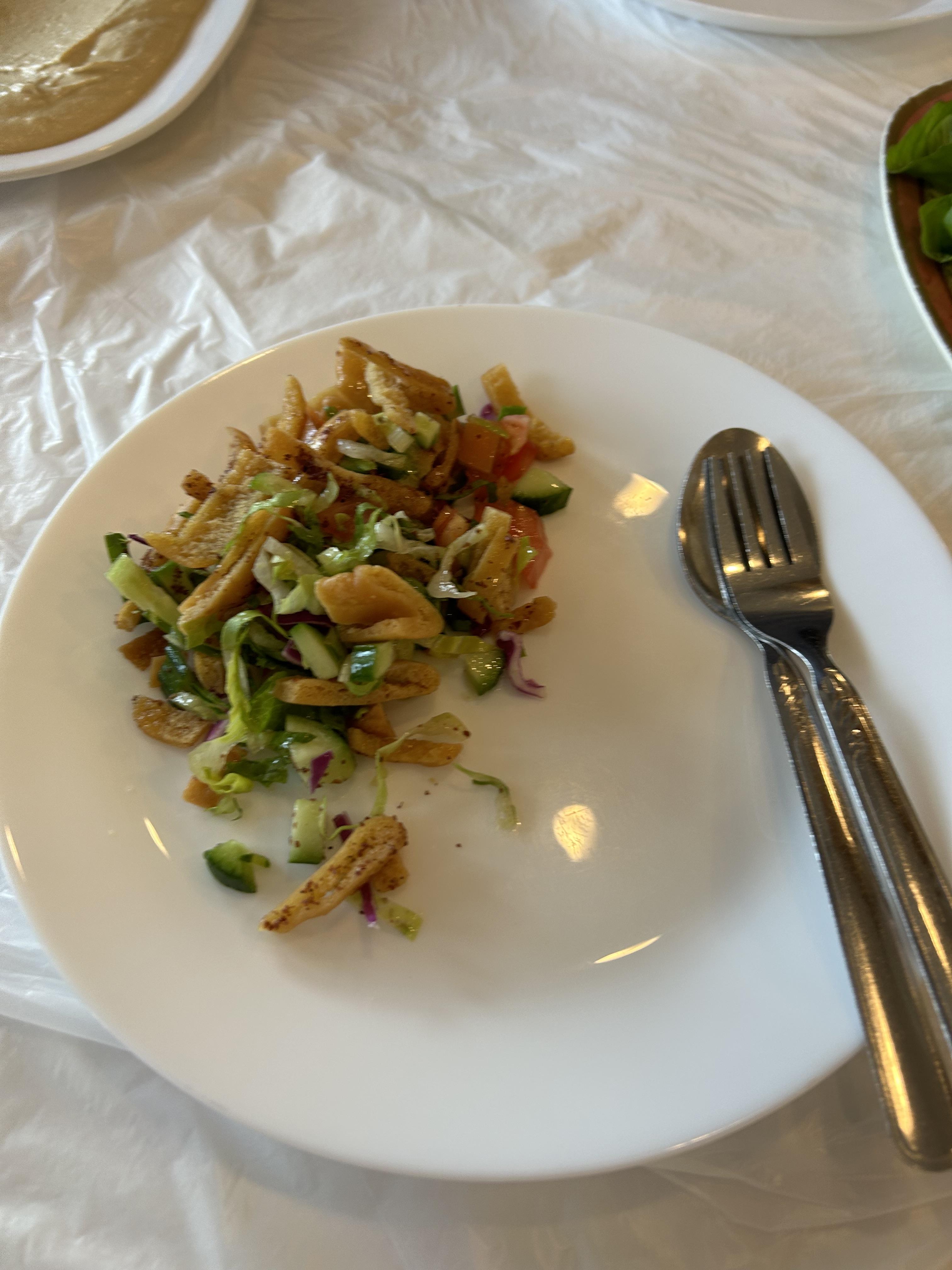 훔무스(Hummus)는 올리브유를 넣어서 먹는데, 나름 맛있다. 콩요리라 건강해지는 느낌도 난다. 납짝빵에 훔무스 찍어 멋는 맛이 괜찮다. 거의 우리의 밥 느낌이다.